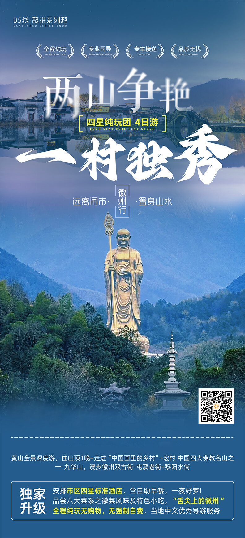 ▲ 莲花佛国游——早约06:30左右酒店接团(淡旺季时间会调整,早餐可打包),乘车约2.5小时赴莲花佛国【九华山】至九华山换乘中心,乘【景区交通车】上山,参观九华山四大丛林之首【祗园禅院】及九华山开山祖寺【化城寺】该寺为九华山最古老的佛寺,为当年金地藏修行之地,敬香祈福平安。(九华街上中餐自理)后参观比丘尼修行处【龙庵】,游览九华山三大宝殿:【华严宝殿】、【大愿宝殿】、【大悲宝殿】,朝拜九华山最大的室内佛像。前往九华山最大的单体寺庙【旃檀林(约30分钟)】,游览全国重点寺庙【上禅堂】,前往后院滴水观音处,接引金瓶圣水洗手洗脸,清心明目,祈福加持。后步行九九八十一台阶上【肉身宝殿】正顶,九华山最大的佛寺建筑群,在1200年前地藏菩萨涅槃之后,肉身不腐、安然如生,后弟子将其肉身安置于此。约14:30左右乘景区交通车下山,结束行程,车返黄山市,入住酒店休息。