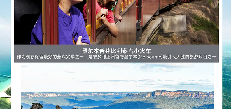早晨抵达后乘车前往【普芬比利蒸汽小火车】(Puffing Billy Railway) 作为现存保留最好的蒸汽火车之一,是维多利亚州首府墨尔本(Melbourne)最引人入胜的旅游项目之一。普芬比利铁路(Puffing Billy Railway)是名副其实的“活”博物馆,也是墨尔本最具标志性的旅游景点之一。它修建于 1900 年,主要为当地山区居民服务,运送乘客、木材、马铃薯和植物等。当年,为了开发维多利亚州偏远地区,总共修建了四条窄轨铁路,普芬比利铁路是其中保存最完好的一条,至今仍运行在贝尔格雷夫(Belgrave)和简布鲁克(Gembrook)之间的原始山区铁道上,穿梭于植被茂密的丹顿农山脉之中。(蒸汽小火车预定火爆,如果预约不上将改为同等价值的尤里卡 88 层观景台)