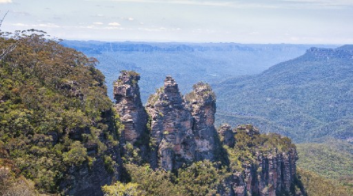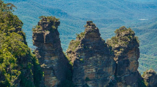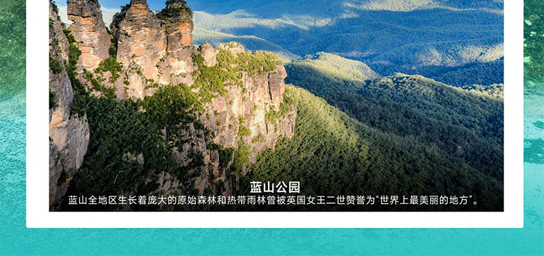 【蓝山国家公园】:座落在新南威尔士州境內,距离悉尼市区约 100 公里,海拔 1000–1200 公尺。蓝山全地区生长着庞大的原始森林和亚热带雨林,里面有 90 种不同品种的尤加利树及超过 400 种的动物种类。【埃科角与三姊妹岩】:沿着埃科角路右拐的尽头处是观赏三姐妹岩的最佳位置埃科角。埃科角的前面贾米森谷谷底就是蓝山的标志就是三姐妹峰。