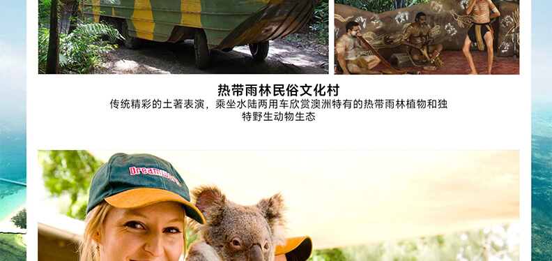 【热带雨林驿站原住民文化村】(约 60 分钟)凯恩斯市郊的雨林驿站原住民文化村您可观赏澳洲原住民传统文化,在户外的剧场内欣赏澳洲原住民精彩的表演,演出传统的澳洲原始原住民音乐及舞蹈、模仿动物形态、打猎情形、传统吹管乐器 didgeridoo 的演奏和敲击乐器及聆听古老乐曲,流泻出远古的传说、您还可尝试投掷传统澳洲原住民回力镖。