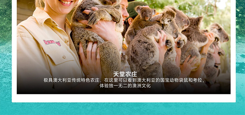 早餐后前往乘坐造价高达 300 万澳元的直升飞机,去欣赏黄金海岸美丽的海岸线!巡航在白色的沙滩上,享受在空中俯瞰壮阔海岸的感觉。黄金海岸直升机可以定制适合您的航程,直接面对公众和澳大利亚的游客开放。随后前往【天堂农庄】天堂农庄位于黄金海岸一片广阔小山丘上,充分展现农庄乡村田园气息。在这里您可以体验到真实的澳洲农庄生活,独一无二的澳洲传统文化。极具澳大利亚传统农庄经营特色的典型的日常生活被集中起来以表演的形式展示给旅游者领略和体验。此外在这里还能看到澳大利亚的“国宝”袋鼠和考拉,您可以在袋鼠生活的灌木丛附近亲手喂食袋鼠,并邂逅憨态可掬考拉。(午餐园内自理)