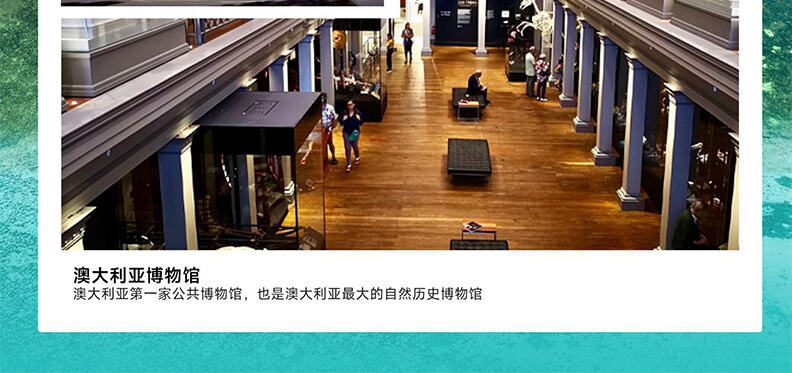 【澳大利亚博物馆】澳大利亚博物馆建于 1827 年,是澳大利亚第一家公共博物馆,也是澳利亚最大的自然历史博物馆 ,着重自然历史和土著居民研究,在自然历史和人类学领域享有很高的国际声誉。博物馆原名为"悉尼博物馆"或"殖民地开拓者博物馆",建馆之初旨在收集"许多罕见的、自然稀有奇特物种标本。其建筑设计创意新颖、风格活泼,以质朴无华的材料勾勒出简洁明快的建筑线条,配之以五颜六色的外墙装饰,令人过目难忘。2001 年,该博物馆曾获世界最佳公共建筑奖--"蓝图建筑风格奖"。2005 年被命名为"澳大利亚最佳主要旅游景点之一"。