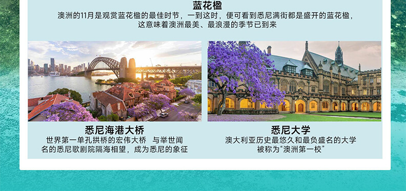 【悉尼大学】它是澳大利亚历史最悠久和最负盛名的大学,被称为“澳洲第一校”,在世界范围内亦是最优秀的高等学府之一。主要校区紧靠新南威尔斯的首府悉尼市中心西南,占地 72 公顷,开办医学、文科、工程等课程。古色古香的校舍在 1857 年建成,保留着澳大利亚传统建筑和文化特色。11 月校园内的蓝花楹,蓝紫色的花朵点缀在青翠的树枝中间,有着一种别样的美丽。在酷夏走在蓝花楹树下,一阵清风吹过,看见蓝花楹花瓣在空中飞舞,让人不由赞赏其脱俗之美。