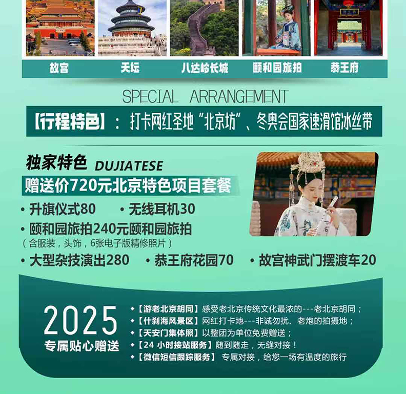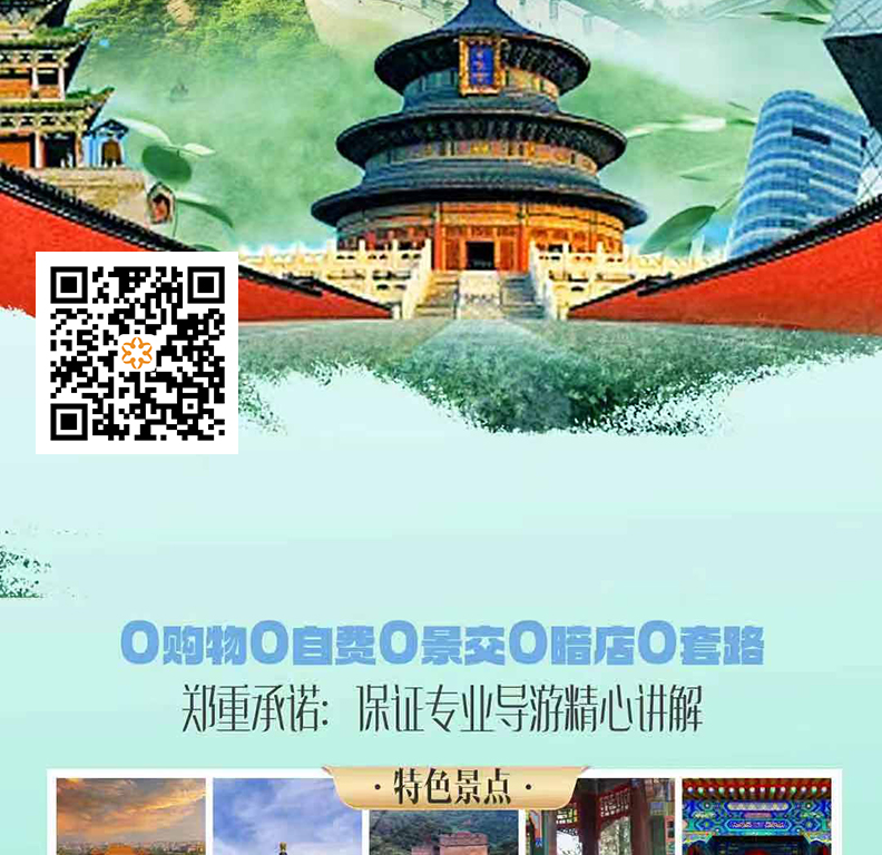 7.北京因政治性原因或交通流量大造成堵车,景区和道路常出现限行与管制情况,在景点不减少的前提下,游览的先后顺序有可能会有调整,具体以北京接待实际情况为准,行程仅供参考。