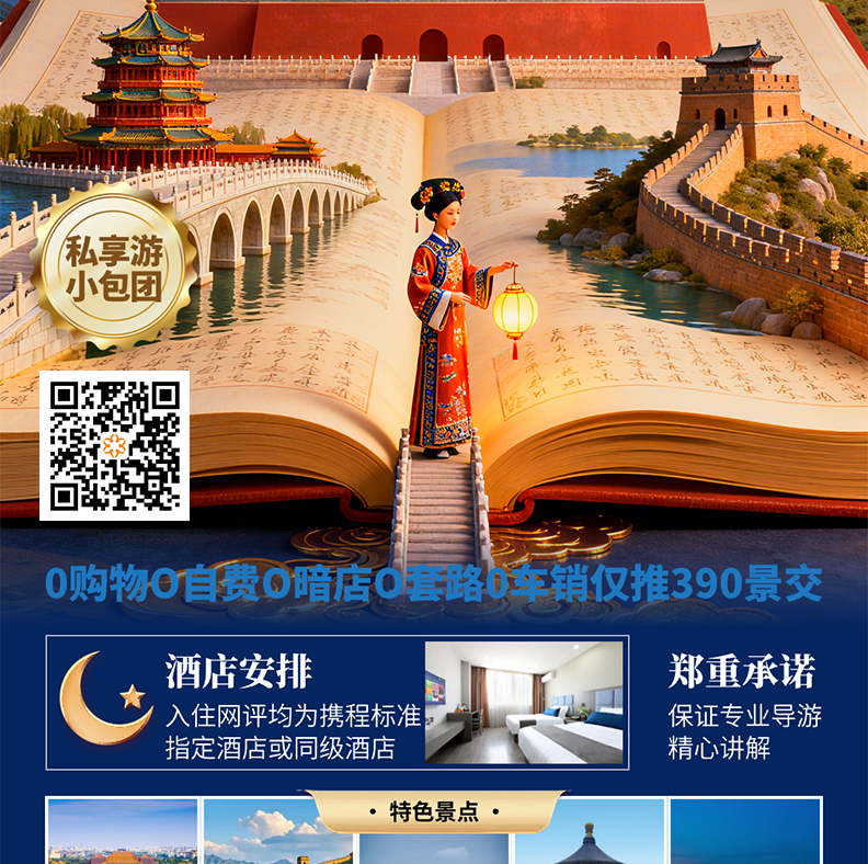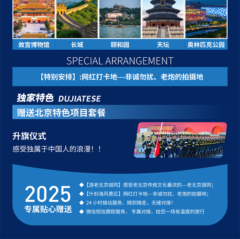 7.北京因政治性原因或交通流量大造成堵车,景区和道路常出现限行与管制情况,在景点不减少的前提下,游览的先后顺序有可能会有调整,具体以北京接待实际情况为准,行程仅供参考。
