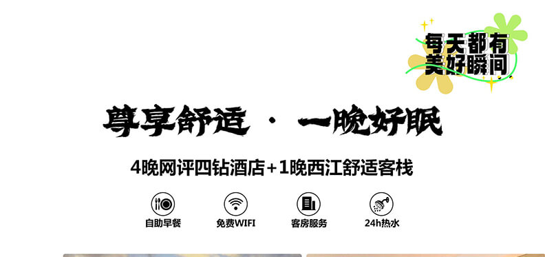 2.由于西江苗寨坐落在山涧,当地客栈房间难免会有潮润的情况,且西江住宿无星级标准,单家客栈房间数量较少,一个散拼团有可能会分几家客栈住宿,敬请理解。