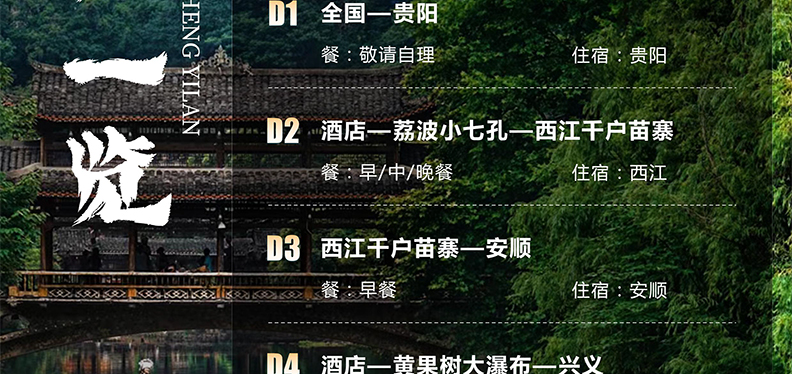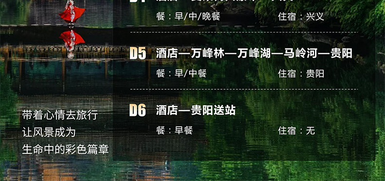 3.不含景区必消小交通:黄果树观光车及保险60元/人+小七孔观光车及保险50元/人+西江4程观光车及保险30元/人+万峰林观光车50元/人+万峰湖游船80元/人,费用需自理。