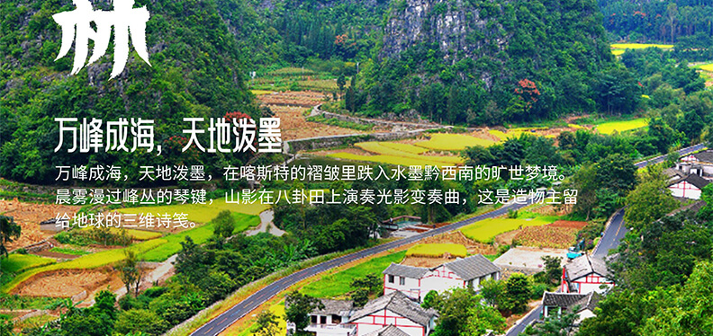 【万峰林】该峰林被<中国国家地理>“选美中国”活动评选为“中国最美的五大峰林” 之一 。 这里的田园风光、布依风情美不胜收 ,让人依依不舍 ,恋恋不忘 。万峰林八卦田是一片天然形成的八卦田 ,平卧在 纳灰寨农田中央 ,其造型神奇迷离,如神匠打造,层叠有序,八卦田中有三个天然地漏深不见底 ,被称为地眼大地的眼睛。据说踩一踩八卦田 ,升官又发财。