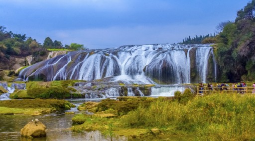 【陡坡塘瀑布】为黄果树瀑布群中最宽的瀑布,是一个高21米、宽达105米的天然坝型瀑布,这里是《西游记》中唐僧师徒四人牵马过河的取景地。