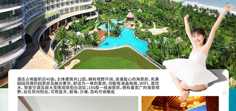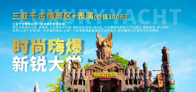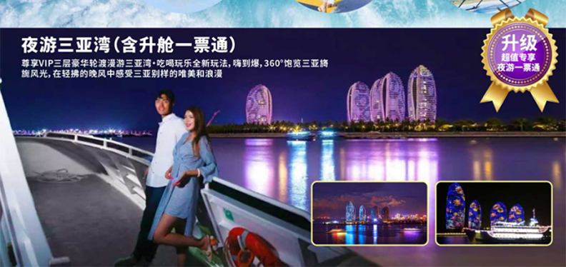 【三亚千古情】:(赠送项目,含门票 + 演出) 海南省唯一获得 "五个一工程" 奖的旅游演艺作品,演绎了三亚的历史和文化传奇。这里能听到落笔洞的万年回声,这里有巾帼英雄冼夫人的荡气回肠,这里有海上丝路的异域风情,这里能看到鉴真东渡时的惊涛骇浪,这里还有鹿回头的美丽传说。在椰风、海韵、沙滩的醉人风景中,感受三亚万年岁月的娓娓道来,寻一段浪漫邂逅。(游览不少于 120 分钟)