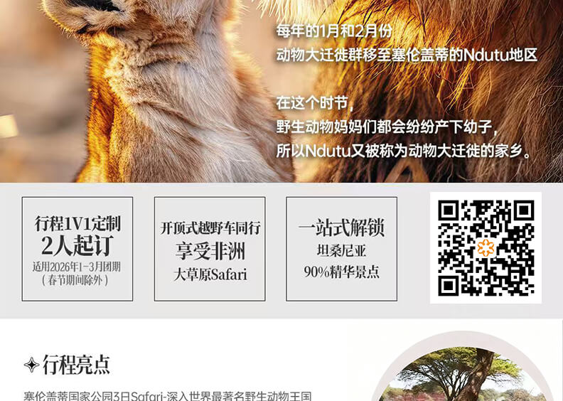 全天:酒店早餐后,前往塞伦盖蒂国家公园进行 Safari。塞伦盖蒂,斯瓦希里语意为“无边的平原”,这里是世界上最古老和最大的生态系统之一。在这里,你有机会目睹狮子、大象、长颈鹿、斑马和羚羊等野生动物的自然行为。乘坐四驱越野车穿越草原,追踪野生动物的足迹,感受大自然的野性和生命力。