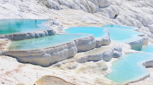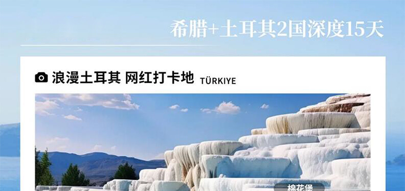 下午:前往温泉的度假胜地——【巴慕卡丽】,又称为【棉花堡】,也是土耳其顶尖的温泉地区,稀有的石灰棚景观被登录为世界遗产 ,含有石灰成分的温泉由高原上流出 ,经过长时间结晶作用后覆盖住整个高原,形成了石灰岩地形 , 由山下往上看就像一座纯白的雪山!