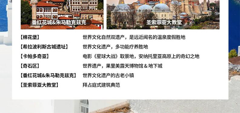 8.行程中有★号景点的首道门票:阿克波里斯、阿波罗神殿、德尔菲博物馆、迈泰奥拉修道院、瓦尔拉姆修道院、托普卡比皇宫、圣索菲亚教堂、果里美露天博物馆、地下城、棉花堡、希拉波里斯古城遗址