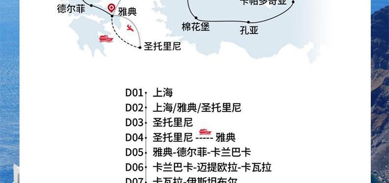 上午 :半天自由活动(自由活动期间 ,不含正餐、交通、导游服务等)。圣托里尼的沙滩不但美 ,还有特别的黑砾滩和黑沙滩 ,带来很别样的爱琴海度假气氛。