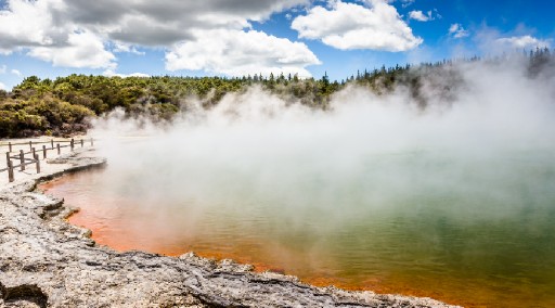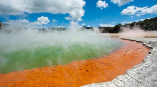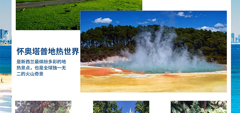 【怀奥塔普地热世界】你看过彩色的温泉吗?它位于奥塔普地热世界,是新西兰最缤纷多彩的地热景点,也是全球独一无二的火山奇景。 这里由于地热活动而形成了独特的地貌,而且能够观赏到独一无二的火山奇景,遍地都是火山活动后留下的塌陷的坑口、冷却或沸腾的泥浆。 沿途你可以欣赏到大小不一的火山口向外着喷发富含化学物质的热泉。这些温泉的水质呈现出淡绿色、淡黄、红铜等,缤纷绚丽,置身其中,如痴如醉。其中全球知名的彩色温泉香槟池和诺克斯夫人间歇泉就在这里。之所以被称为香槟池,是因为池中大量二氧化碳的释出如同玻璃杯中香槟酒的气泡,这是一个天然的彩色温泉、气泡翻滚的泥浆池、蒸汽腾腾的地面、广阔的全景风光、巨大的火山口以及矿物沉淀完美组合在一起的五彩台地。此外,“撒旦池”、“画家的调色板”和“新娘面纱瀑布”也是千万不能错过的景点。 在令人惊叹的火山景观及热气弥漫的地热奇景中,享受它带给你的惊艳之感,仿佛置身于梦幻仙境中,亲感绚烂的光影色彩。