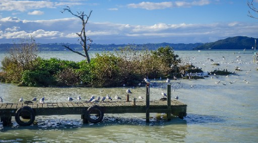 【罗托鲁阿湖】湖水清澈湛蓝,湖畔有成群海鸥、野鸭、黑天鹅在水中游戏。