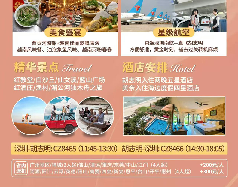 早餐后乘车前往著名的【白沙丘】车程约1小时,方圆两公里左右,沙丘呈新月形,沙粒细腻,曲线曼妙,沙雾随风起。踩在松软的沙石上,起伏连绵。人像是要陷进去,实际上却能完全自如地掌控身体。土路与沙丘之间有面湖,清澈而深邃。湖里长满了水草与荷花,衬得湖水清雅之极,触手便可捞起沙丘的倒影。一旁,还有马儿在水里悠闲地吃草,原以为沙漠里的绿洲只是一个美丽传说,却是真的有随后在黄昏之前乘车前往【红沙丘】,红沙丘是一片热情的土地,说这里适合看日落一点也不假。当夕阳的余晖笼罩美奈时,很难分得清,这红沙丘是浑然天成,还是被染红的。在这里玩滑沙是最好不过。后前往参观【Fairy stream仙女溪】(约1.5小时),仙女溪是蜿蜒在红沙谷里的一条小溪,溪水清澈,赤脚走在溪水里,浅浅的水花刚好没过脚踝,踩在水里的脚底可以感受到沙石的细腻和溪水的清凉。我们逆流而上,在蓝天白云的映衬下,左岸红色的沙化山脊与右边成片的椰林稻田构成了一幅清新美丽的画卷。随后趁着黄昏时分,前往美奈最具盛名的【渔村】,美奈的渔村是相当出名的,不信你看看Lonely Planet的越南篇的封面就用的黄昏的美奈渔村就可见一斑。只见静静的港湾密密麻麻的停满了渔归的小船,暖暖的落日将余晖铺洒在海面上,整个小渔港笼罩在一层淡淡的、暖暖的金纱里。晚上前往美奈海边,可以自选餐厅(自理),尝尝当地最新鲜的海鲜,丰俭由人,环境也十分优美,可以享受到迷人的海景和海风,让你在品尝美味的同时也可以放松身心。